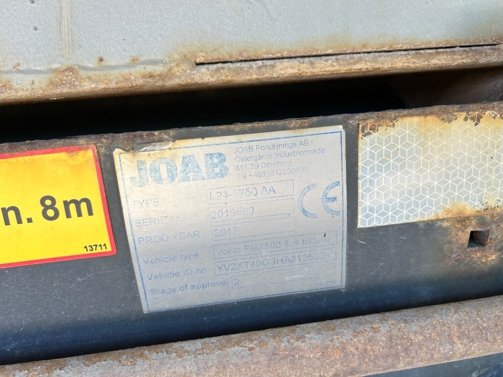 Make: VOLVO Model: FMX 500 8X4 Truck, Hooklift and Plow Truck Year model: 2017 Mileage: 395077km (Runs sporadically) so mileage may change Engine: 12777 cm3 375kw (500hp) Euro 6 Gearbox: I-shift AC Rear view camera Diesel heater Micro oven Coffee maker Alcohol interlock VEB exhaust brake Drive shaft: Single gear Suspension: Air suspension front and Air suspension rear. (Disc brakes) Tire size: 385-65R22,5 Front and rear, 315-80R22,5 Drive axles. The tires are in good condition. Tipper hydraulics: Car and trailer/barrow VBG air traction 795 Last approved inspection: 24-03-05 Inspected no later than 25-02-28 Under construction JOAB L24-5750 JOAB hook-lift truck Roof arch with Ledramp and 4 extra lights Front bow plow lighting Front bracket VV95 Mählers Side hitch Flex Rear sliding boom Dimensions and weight Overall length: 9450mm Overall width: 2545mm Wheelbase: 3700mm Service weight: 15 010kg Maximum load weight: 16 990kg Permitted total weight: 32 000kg Plow truck with load changer in good condition The car is sold in the condition shown